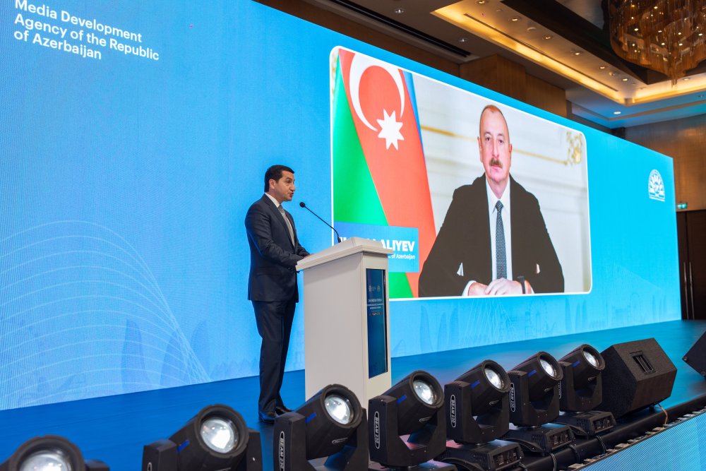 Bizim.Media xəbər verir ki, Regional və beynəlxalq müstəvidə informasiya mübadiləsinin təkmilləşdirilməsi, media sahəsində əməkdaşlığın gücləndirilməsi, dezinformasiyaya qarşı mübarizə üzrə birgə mexanizmlərin formalaşdırılması, rəqəmsal media istiqamətində birgə layihələrin təşviqi və təcrübələrin paylaşılması məqsədilə təşkil olunan forumun açılış mərasimində Azərbaycan Respublikası Prezidentinin köməkçisi – Azərbaycan Respublikası Prezidentinin Administrasiyasının Xarici siyasət məsələləri şöbəsinin müdiri Hikmət Hacıyev əvvəlcə Azərbaycan Respublikasının Prezidenti İlham Əliyevin Forum iştirakçılarına müraciətini səsləndirib.
