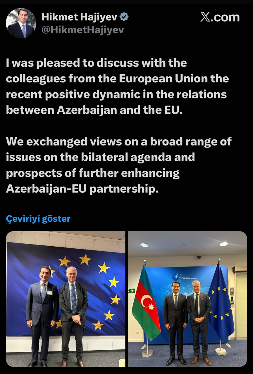 "Mən Avropa İttifaqından olan həmkarlarımla Azərbaycan və Aİ arasında münasibətlərdə son vaxtlar müşahidə olunan müsbət dinamikanı müzakirə etməkdən məmnun oldum.