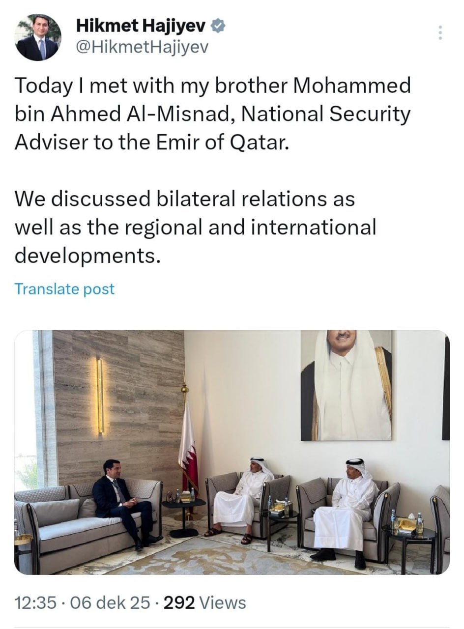 “Bu gün Qətər əmirinin milli təhlükəsizlik məsələləri üzrə müşaviri, qardaşım Əhməd əl-Misnadla görüşdüm. İkitərəfli əlaqələri, eləcə də regional və beynəlxalq yenilikləri müzakirə etdik”.