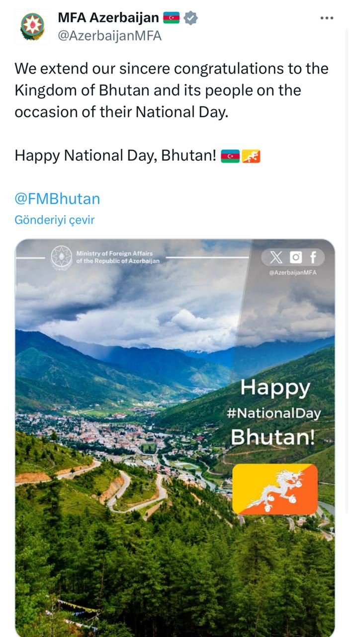 "Butan Krallığını və xalqını Milli Günü münasibətilə səmimi-qəlbdən təbrik edirik. Butan, Milli Günün mübarək!", - paylaşımda qeyd olunub.