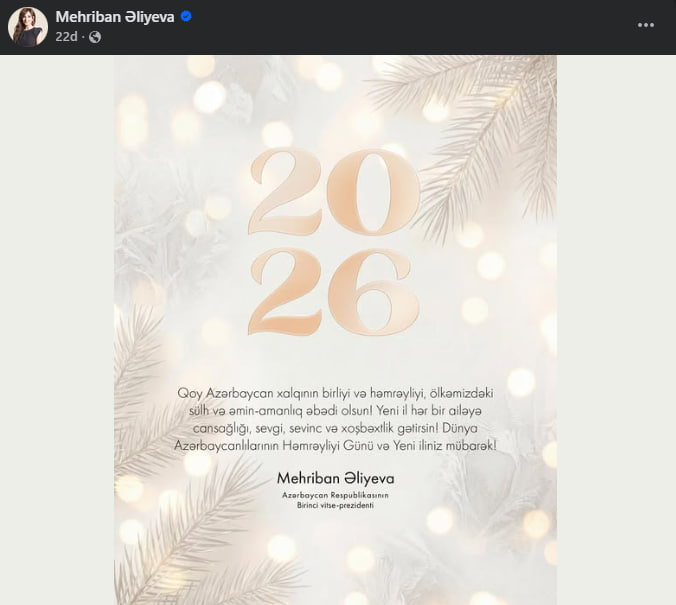 Azərbaycanın Birinci vitse-prezidenti Mehriban Əliyeva sosial şəbəkə hesablarında 31 Dekabr Dünya Azərbaycanlılarının Həmrəyliyi Günü və Yeni illə bağlı paylaşım edib.