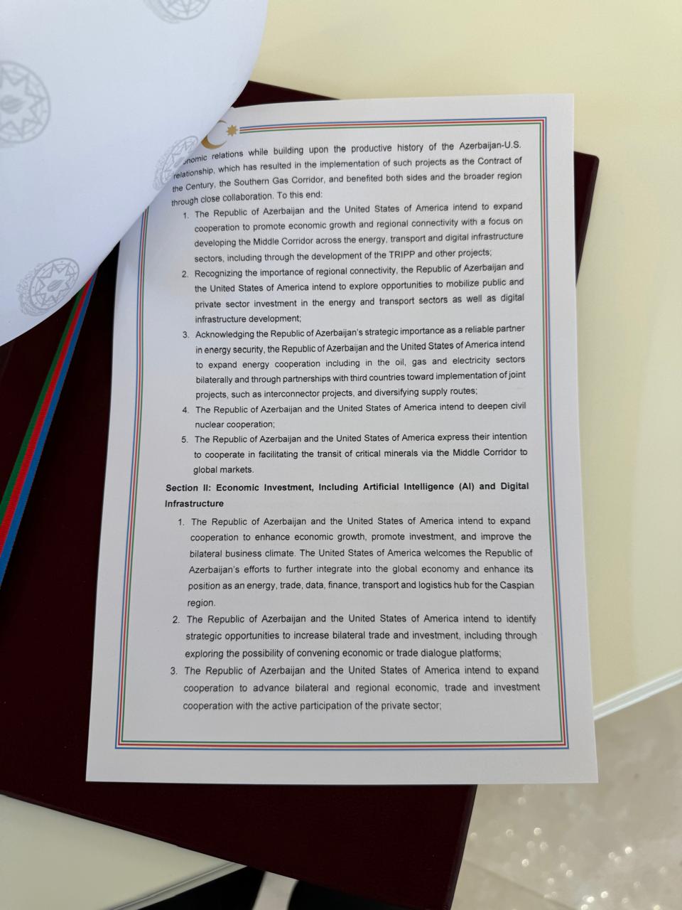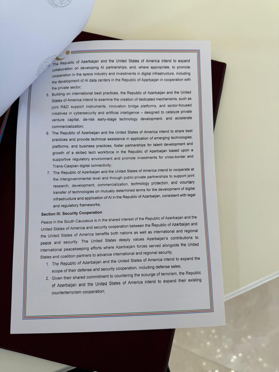 Azərbaycan Respublikası və Amerika Birləşmiş Ştatları AI tərəfdaşlıqlarının inkişaf etdirilməsi üzrə əməkdaşlığı genişləndirmək və müvafiq hallarda, kosmik sənaye sahəsində əməkdaşlığı və Azərbaycan Respublikasında özəl sektorla əməkdaşlıq ilə AI data mərkəzlərinin inkişafı da daxil olmaqla, rəqəmsal infrastruktura sərmayə qoyuluşunu təşviq etmək niyyətindədirlər;