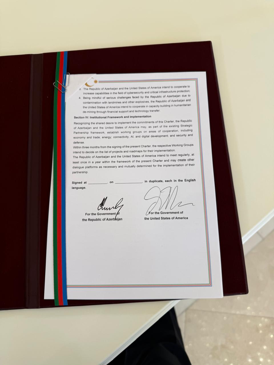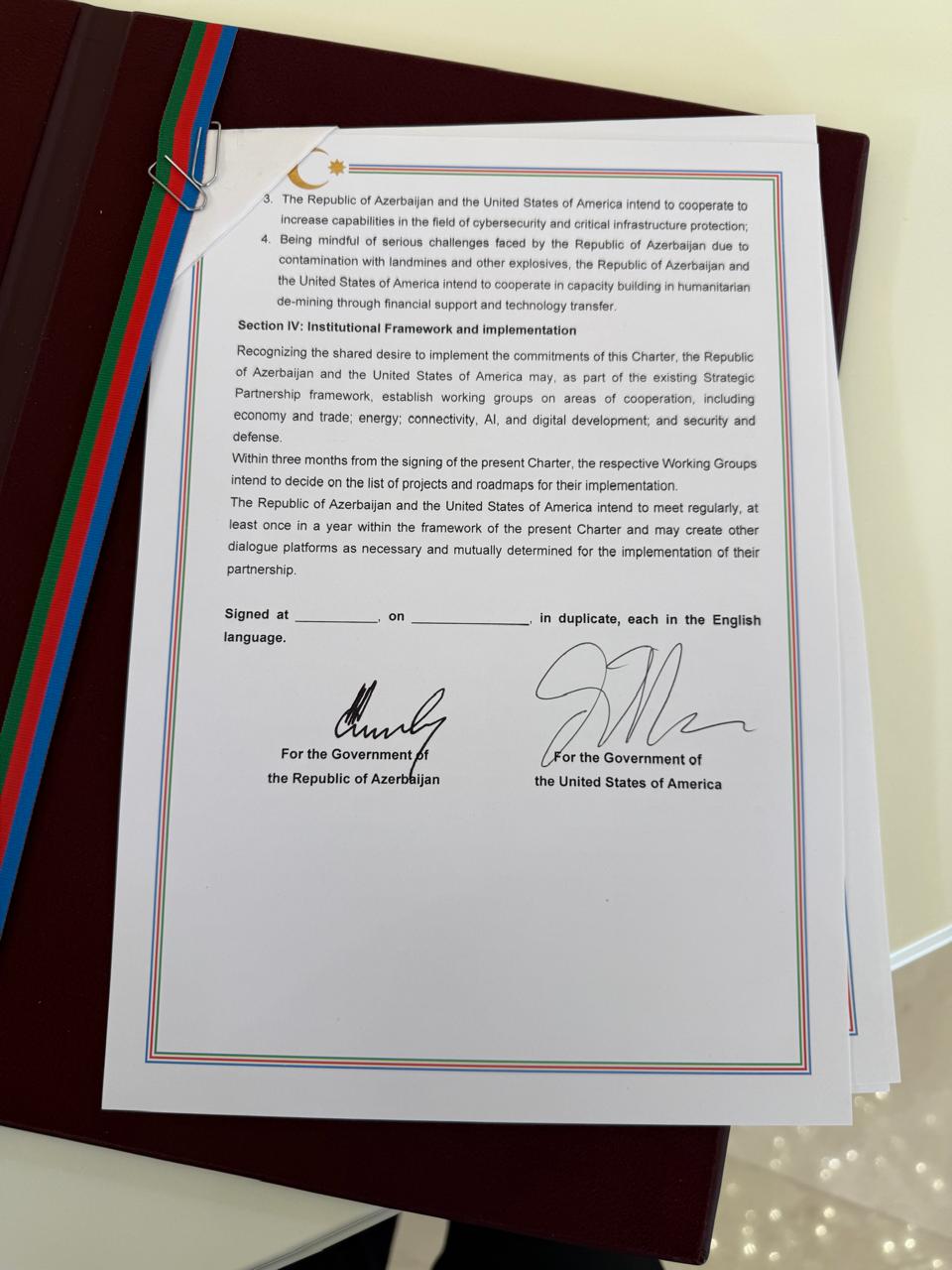 Azərbaycan Respublikası və Amerika Birləşmiş Ştatları bu Xartiyadan irəli gələn öhdəliklərini yerinə yetirməklə bağlı ortaq niyyəti qəbul edərək, mövcud Strateji Tərəfdaşlıq çərçivəsinin bir hissəsi kimi, iqtisadiyyat və ticarət; enerji; bağlantılar, AI və rəqəmsal inkişaf; təhlükəsizlik və müdafiə daxil olmaqla, əməkdaşlıq sahələri üzrə işçi qrupları yarada bilərlər.