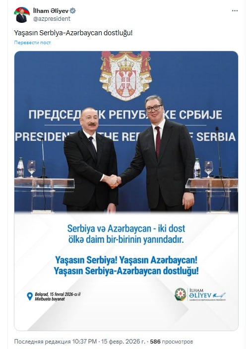 Azərbaycan Prezidenti İlham Əliyevin "X"dəki hesabında Belqradda Serbiya Respublikasının Prezidenti Aleksandar Vuçiçlə görüşü ilə bağlı paylaşım edilib.