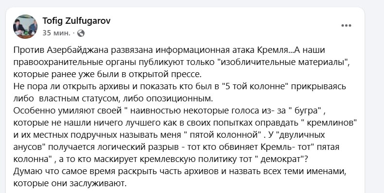 Bizim.Media xəbər verir ki, diplomat Kremlin Azərbaycana qarşı informasiya hücumuna keçdiyini bildirərək, hüquq-mühafizə orqanlarını və cəmiyyəti daha cəsarətli addımlar atmağa çağırıb.