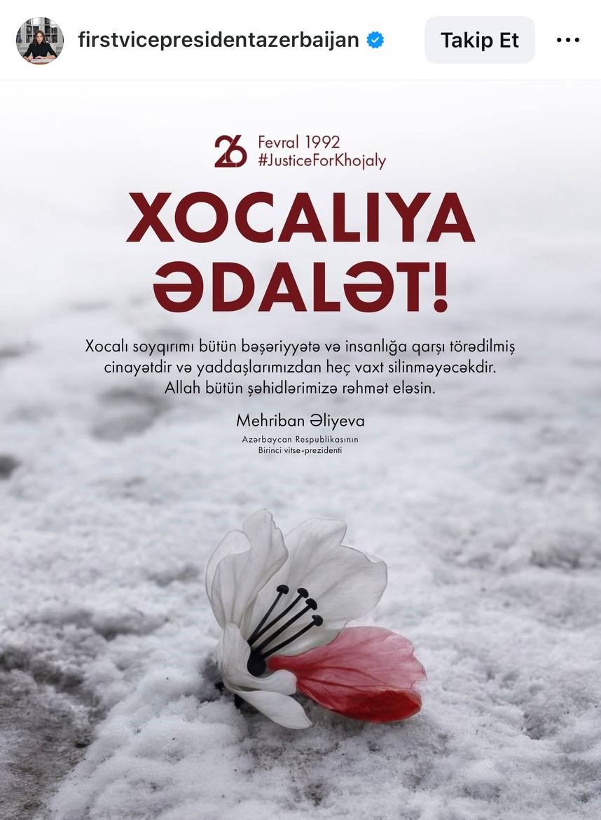 "Xocalı soyqırımı bütün bəşəriyyətə və insanlığa qarşı törədilmiş cinayətdir və yaddaşlardan heç vaxt silinməyəcəkdir. Allah bütün şəhidlərimizə rəhmət eləsin".