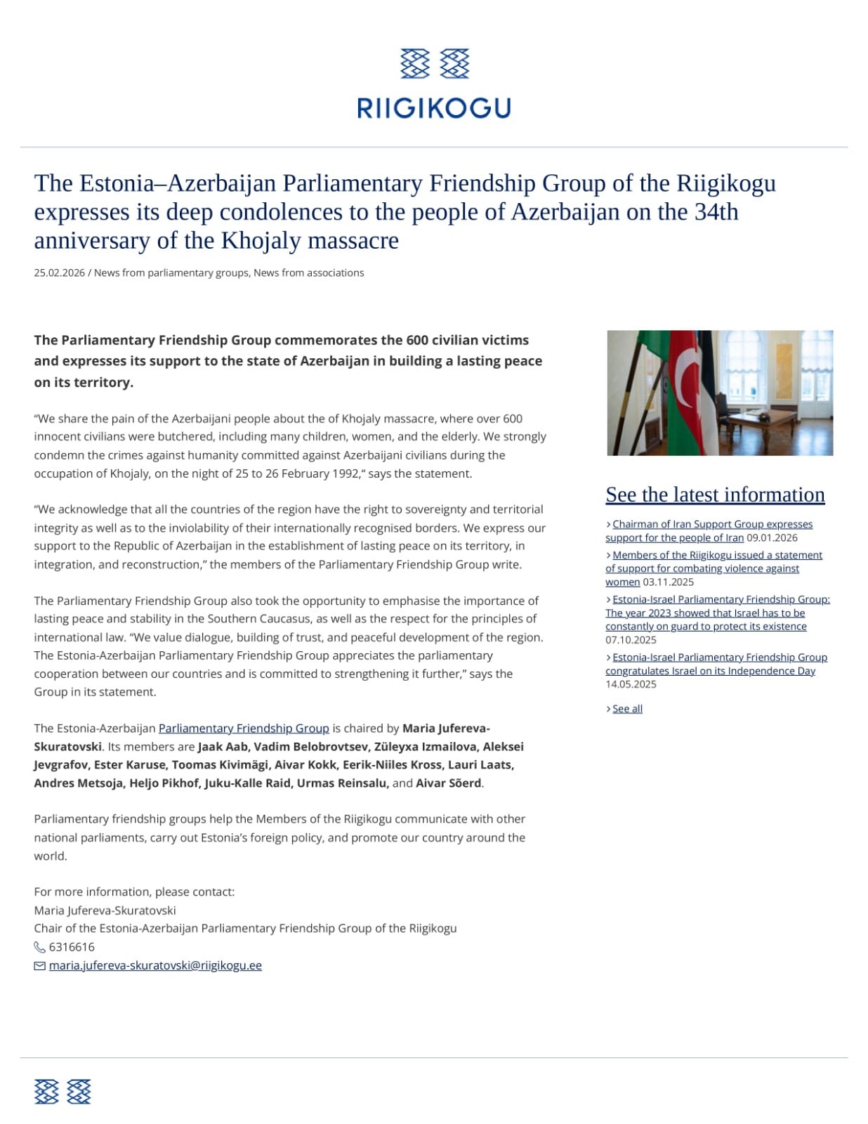 Parlamentlərarası Dostluq Qrupu həmçinin Cənubi Qafqazda davamlı sülh və sabitliyin, eləcə də beynəlxalq hüquq prinsiplərinə hörmətin vacibliyini vurğulamaq fürsətindən istifadə edir, dialoqa, etimadın qurulmasına və regionun dinc inkişafına dəyər veririk. Estoniya–Azərbaycan Parlamentlərarası Dostluq Qrupu ölkələrimiz arasında parlament əməkdaşlığını yüksək qiymətləndirir və onu daha da gücləndirməyə sadiqdir”.