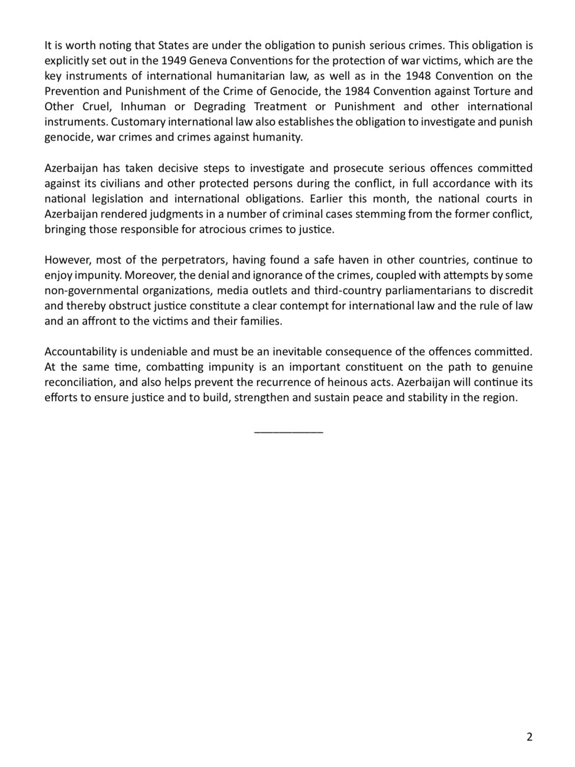Qeyd edilib ki, Azərbaycan ədalətin təmin olunması, eləcə də regionda sülh və sabitliyin qurulması, möhkəmləndirilməsi və davamlılığının təmin edilməsi istiqamətində səylərini davam etdirəcəkdir.
