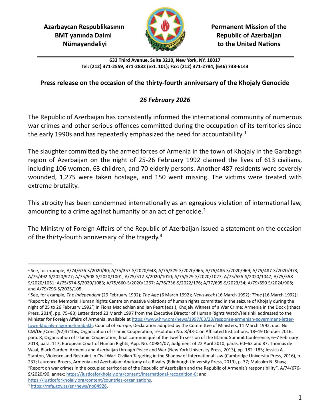 Xocalı soyqırımının 34-cü ildönümü ilə bağlı Azərbaycanın BMT yanında Daimi Nümayəndəliyi Ermənistanın törətdiyi vəhşiliklər barədə bəyanat yayıb.