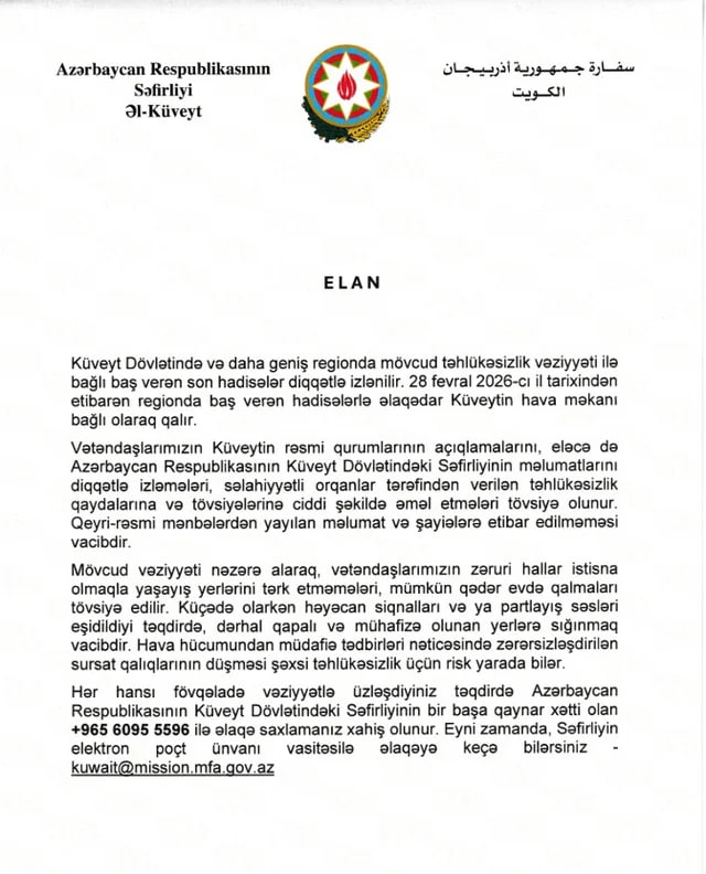 "Küveyt Dövlətində və daha geniş regionda mövcud təhlükəsizlik vəziyyəti ilə bağlı baş verən son hadisələr diqqətlə izlənilir. 28 fevral 2026-cı il tarixindən etibarən regionda baş verən hadisələrlə əlaqədar Küveytin hava məkanı bağlı olaraq qalır".