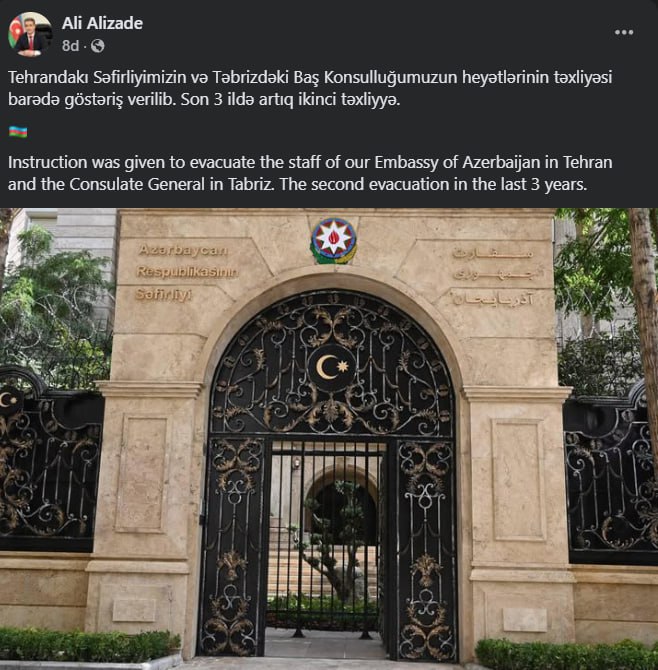 Azərbaycanın Tehrandakı səfirliyinin və Təbrizdəki Baş Konsulluğunun təxliyəsi barədə göstəriş verilib.