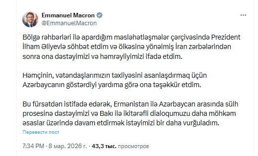 Makron həmçinin Azərbaycanın Fransa vətəndaşlarının təxliyəsinə göstərdiyi yardıma görə təşəkkür etdiyini bildirib.