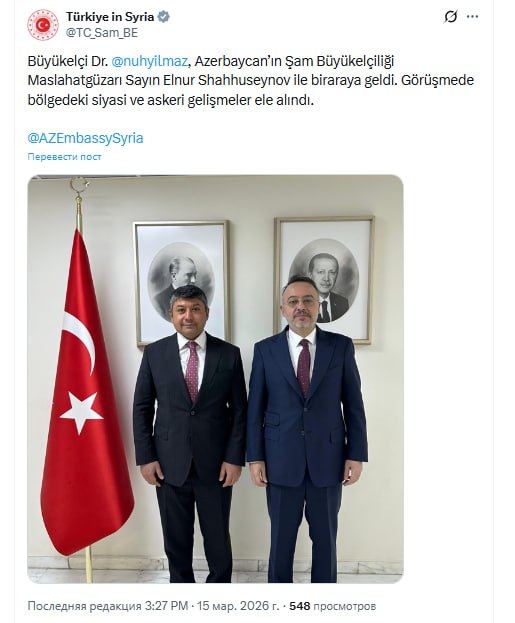 Türkiyənin Suriyadakı səfiri Nuh Yılmaz və Azərbaycanın Dəməşqdəki səfirliyinin müvəqqəti işlər vəkili Elnur Şahhüseynov arasında görüş keçirilib.