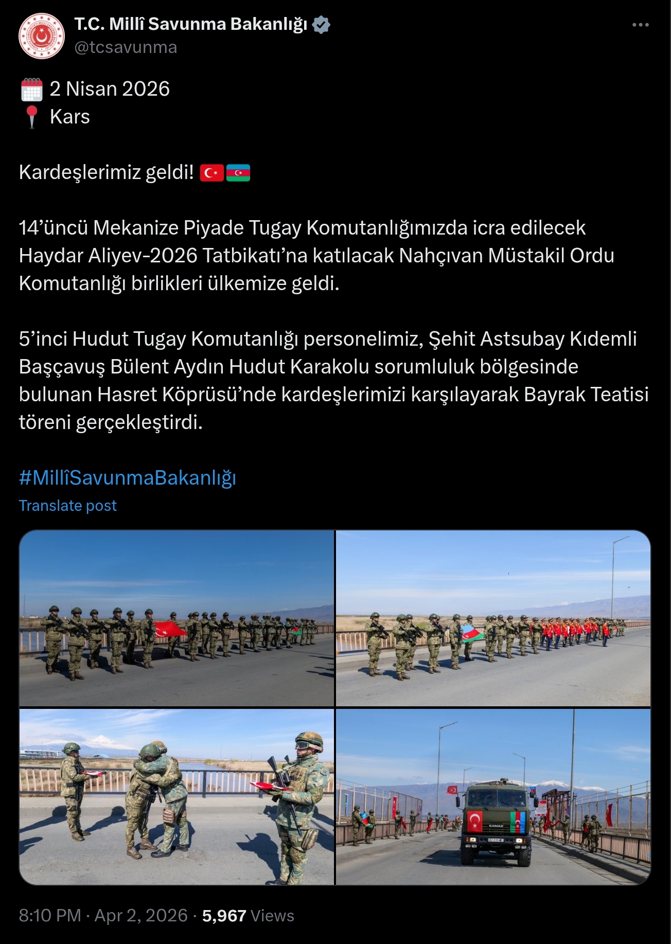 Qeyd olunub ki, Türkiyənin 5-ci Sərhəd Briqadası Komandanlığının şəxsi heyəti Umid körpüsündə azərbaycanlı hərbçiləri qarşılayıb və bayraq mübadiləsi mərasimi icra edilib.