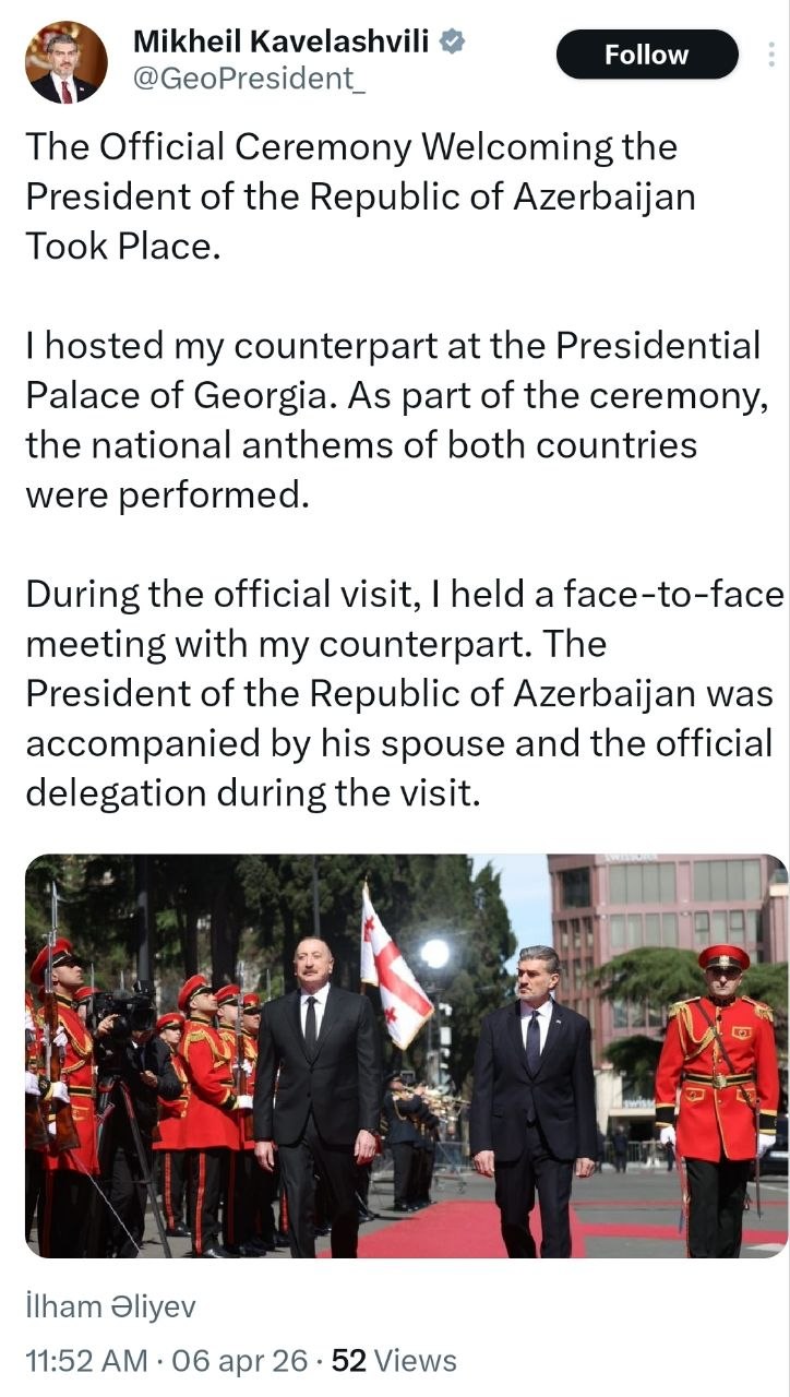Bizim.Media xəbər verir ki, Prezident İlham Əliyevin səfəri barədə Kavelaşvilinin "X” hesabındakı paylaşımda deyilir: