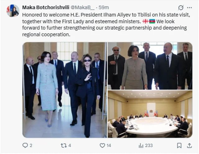 "Azərbaycan Prezidenti İlham Əliyevi, birinci xanım Mehriban Əliyevanı və hörmətli nazirləri Tbilisidə salamlamaq bizim üçün böyük şərəfdir. Biz strateji tərəfdaşlığımızın daha da gücləndirilməsinə və regional əməkdaşlığın inkişafına ümid edirik", - o yazıb.