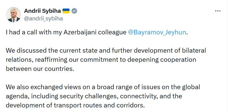 Ukraynanın xarici işlər naziri Andrey Sibiqa Azərbaycan xarici işlər naziri Ceyhun Bayramova zəng edib.