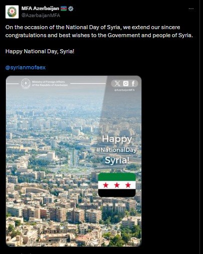 Azərbaycan Xarici İşlər Nazirliyi (XİN) Suriyanı Milli Gün münasibətilə təbrik edib.